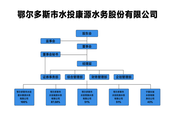 鄂爾多斯市水投康源水務(wù)股份有限公司成立于2009年6月15日,注冊資本538,244,782.00元人民幣,是由鄂爾多斯市水務(wù)投資控股集團(tuán)有限公司(持股99%)和鄂爾多斯市農(nóng)牧業(yè)投資開發(fā)有限公司(持股1%)共同出資成立的股份制有限公司。公司下轄1家全資子公司、3家控股子公司和1家參股子公司。公司內(nèi)設(shè)四個(gè)部門,分別是證券事務(wù)部、綜合管理部、財(cái)務(wù)管理部、企劃管理部,共有職工246人。