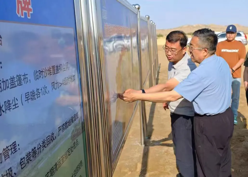 在項目現(xiàn)場,陳德華一行詳細了解項目進度,聽取“機械化+人工”協(xié)同作業(yè)情況匯報,強調(diào)要把握種草施工期,優(yōu)化工序,高效推進項目。針對質(zhì)量安全,他抽查草方格、苗木種植情況,要求要落實“網(wǎng)格化”追溯制,對不合格工程即查即改,同時加強沙漠施工安全監(jiān)管,開展防暑、防沙塵暴演練。他還仔細查看農(nóng)牧民工工資臺賬,要求杜絕出現(xiàn)拖欠薪資情況,保障農(nóng)民工權(quán)益。