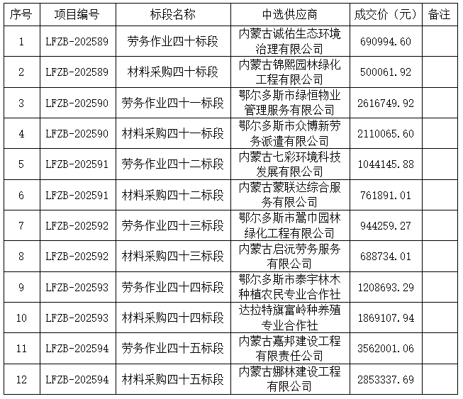 內(nèi)蒙古利凡工程項目管理有限公司受鄂爾多斯市水投惠源建設有限公司的委托,于2025年04月29日就內(nèi)蒙古自治區(qū)鄂爾多斯市庫布其沙漠北緣鎖邊林草帶西段、中段、東段沙化土地綜合治理項目--勞務作業(yè)、材料采購四十至四十五標段以比選方式進行采購,經(jīng)評審小組評議,現(xiàn)將本次采購的中選結果公告如下。