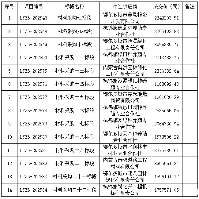 內(nèi)蒙古利凡工程項(xiàng)目管理有限公司受鄂爾多斯市水投惠源建設(shè)有限公司的委托,于2025年04月24日就內(nèi)蒙古自治區(qū)鄂爾多斯市庫(kù)布其沙漠北緣鎖邊林草帶西段、中段、東段沙化土地綜合治理項(xiàng)目--材料采購(gòu)七、九至十一標(biāo)段以比選方式進(jìn)行采購(gòu),于2025年04月25日就內(nèi)蒙古自治區(qū)鄂爾多斯市庫(kù)布其沙漠北緣鎖邊林草帶西段、中段、東段沙化土地綜合治理項(xiàng)目--材料采購(gòu)十三至二十二標(biāo)段以比選方式進(jìn)行采購(gòu),經(jīng)評(píng)審小組評(píng)議,現(xiàn)將本次采購(gòu)的中選結(jié)果公告如下。