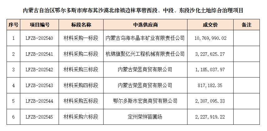 內(nèi)蒙古利凡工程項目管理有限公司受鄂爾多斯市水投惠源建設(shè)有限公司的委托,于2025年04月23日就內(nèi)蒙古自治區(qū)鄂爾多斯市庫布其沙漠北緣鎖邊林草帶西段、中段、東段沙化土地綜合治理項目--材料采購一至六標(biāo)段以比選方式進(jìn)行采購,經(jīng)評審小組評議,現(xiàn)將本次采購的中選結(jié)果公告如下。