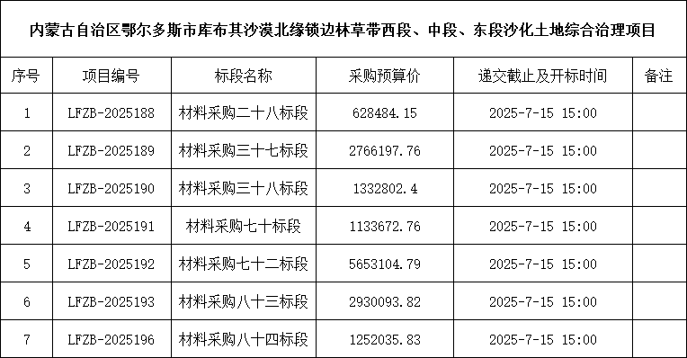 內(nèi)蒙古利凡工程項目管理有限公司受鄂爾多斯市水投惠源建設有限公司的委托,采用比選的方式,對內(nèi)蒙古自治區(qū)鄂爾多斯市庫布其沙漠北緣鎖邊林草帶西段、中段、東段沙化土地綜合治理項目--材料采購7個標段進行采購,歡迎符合資格條件的應選人前來參加: